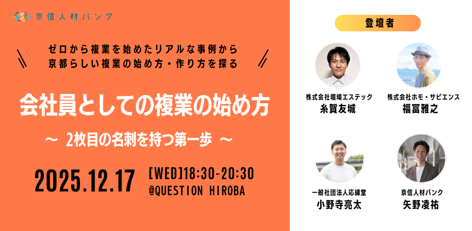 コミュニティ・バンク京信の共創施設QUESTION1階のHIROBAにて「会社員の複業」をテーマに、京都ならではのリアルな事例や新たなチャレンジをご紹介します。後半はゲスト・参加者の皆さまが繋がっていただくための懇親会を開催します。